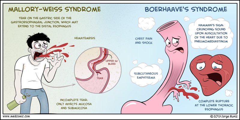 - Mallory Weiss/Boerhaave’s: These 2 distinct tears in esophagus are caused by excessive vomiting. Mallory Weiss is typically seem with your “weekend warriors” who party too hardy, then vomit repeatedly, producing a transverse tear in their esophagus that bleeds. While not a fun bleed, Boerhaave’s is significantly worse. With this type, a bulimic person (vomits after eating) retches repeatedly producing a full thickness tear of the esophagus resulting in gastric contents in your chest cavity, significantly worse bleeding and eventual sepsis. These are the patients that crash hard and fast!